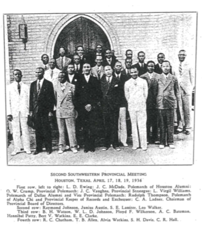 Dr. Charles W. Pemberton was the 1st Polemarch of the Houston Alumni Chapter. In 1929, the first two initates of Houston Alumni Chapter were F.L. Howard and D.P. Young.